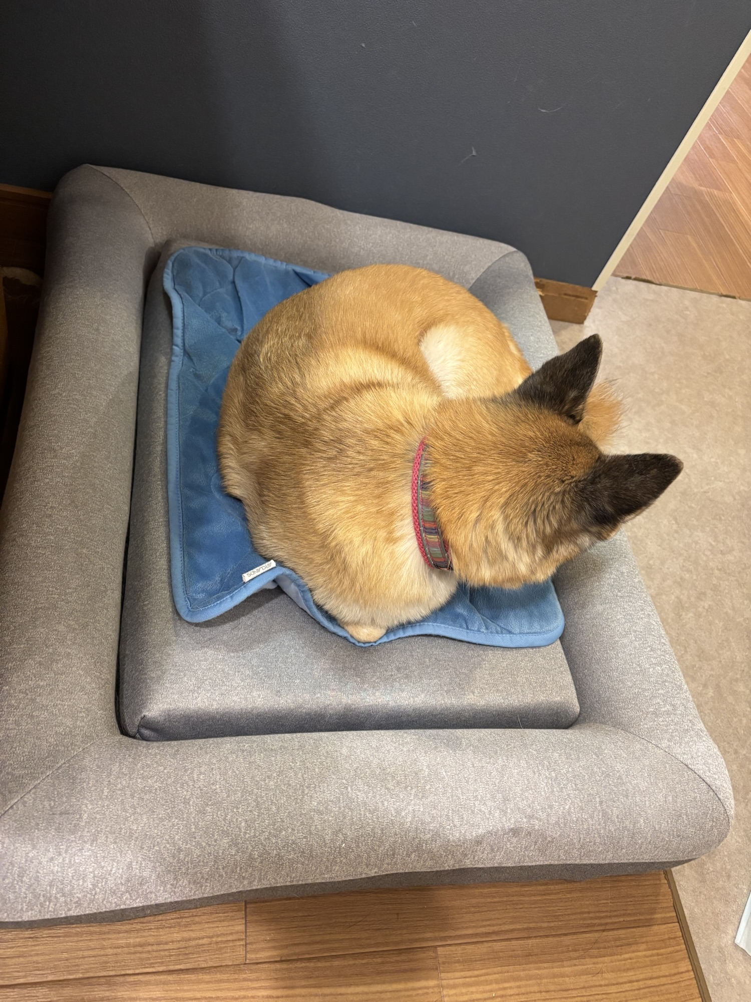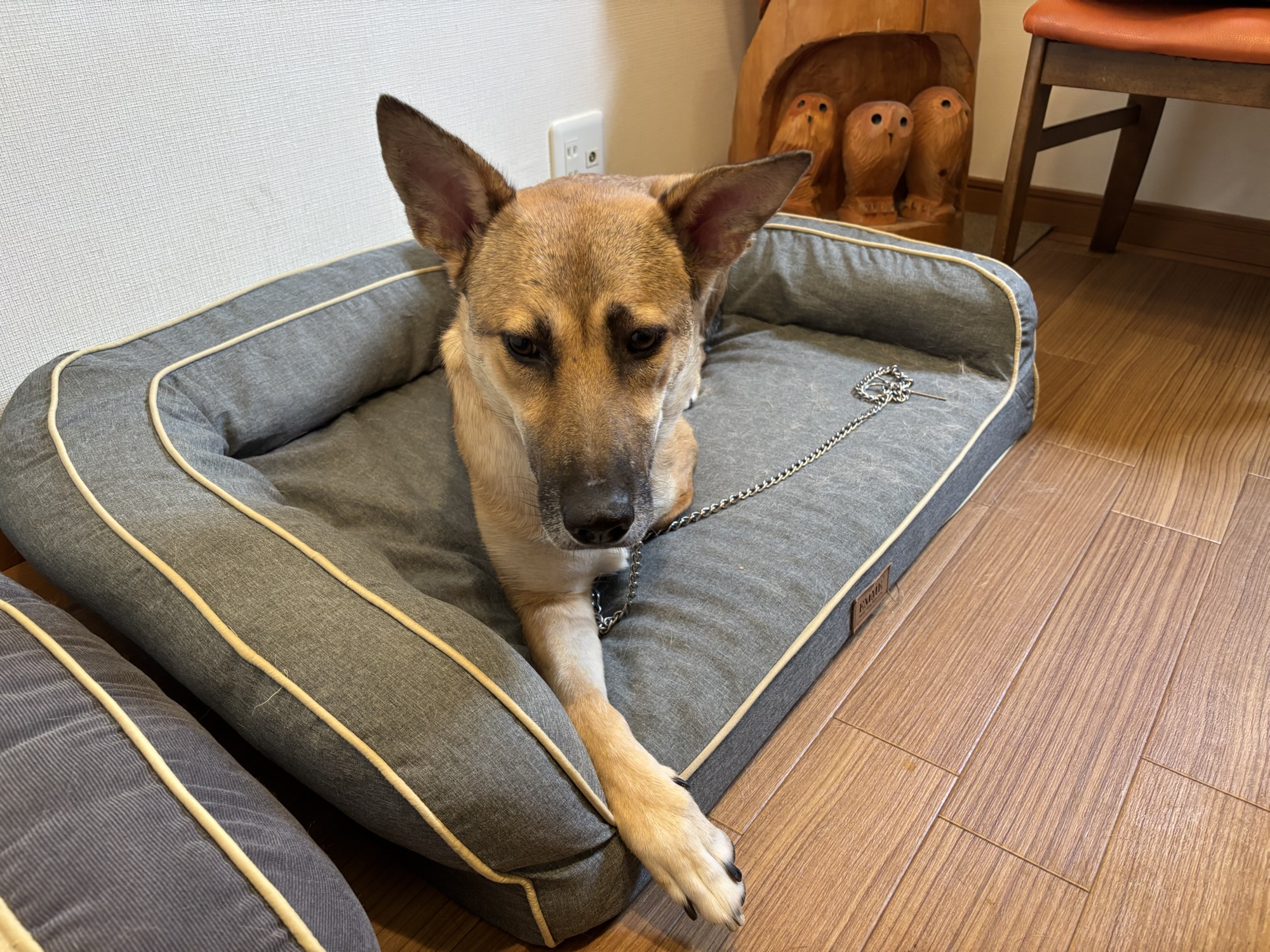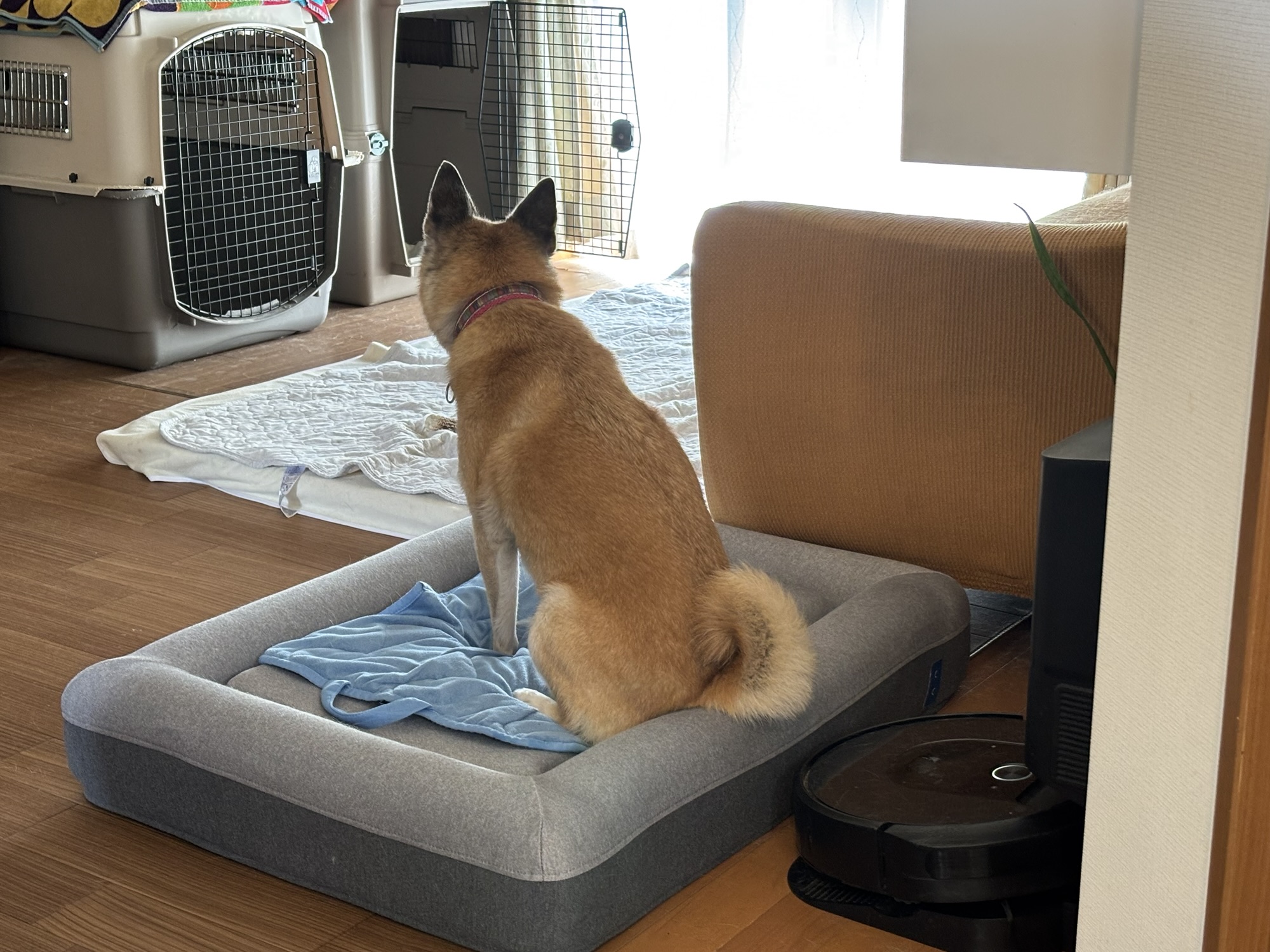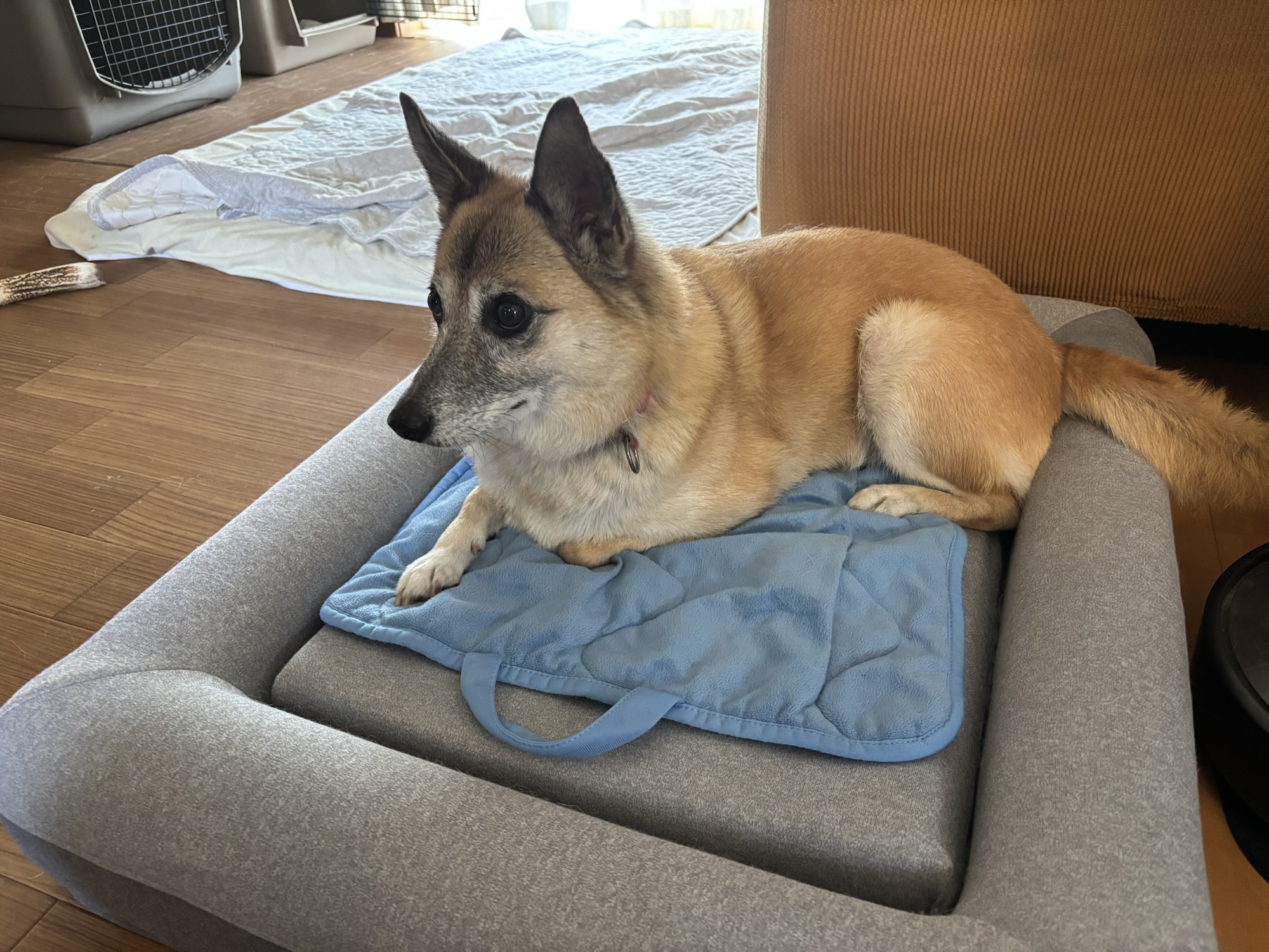 やっと、持参したドッグベッドに座りました。