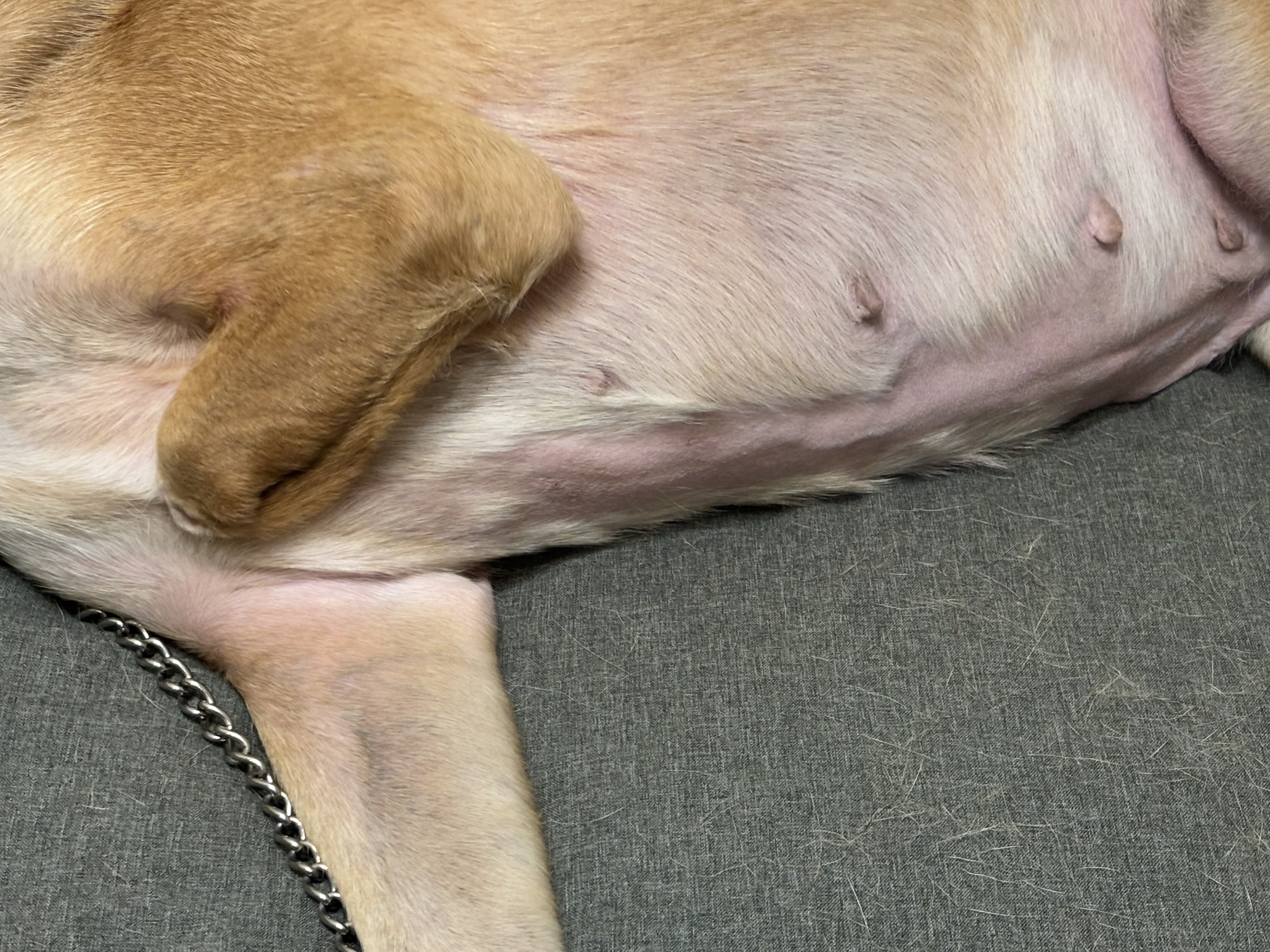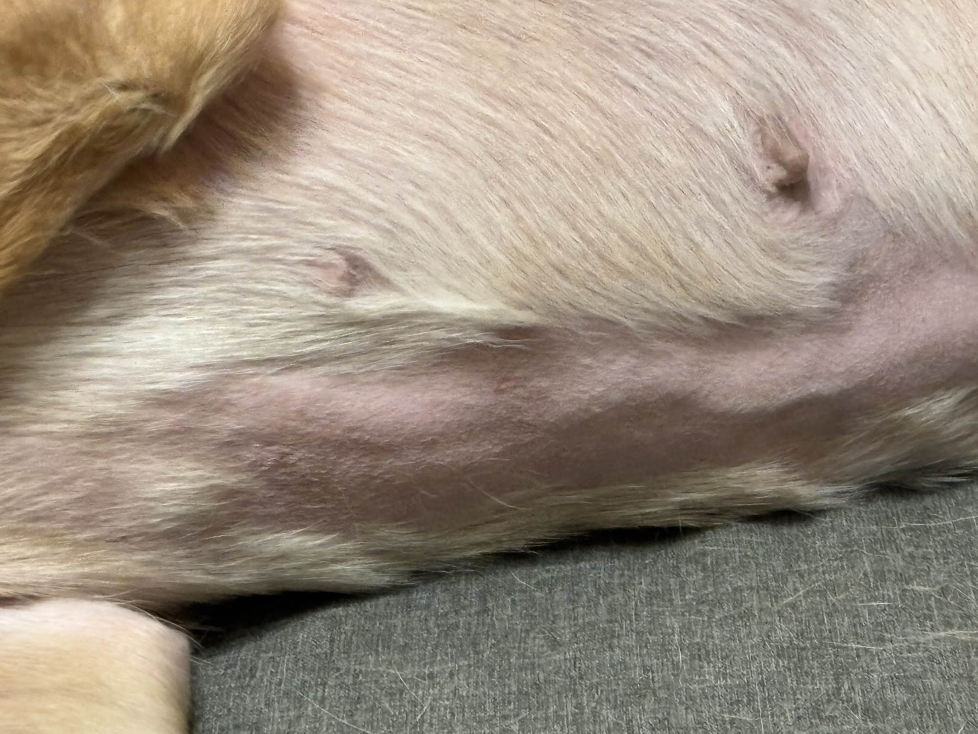 換毛期と相まって、お腹の毛も抜けてしまい生えてこないです。