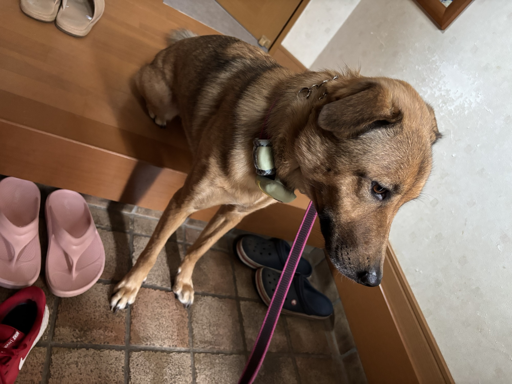 お散歩前の、トゥルーたんのお座り(玄関前で座って待たせる)