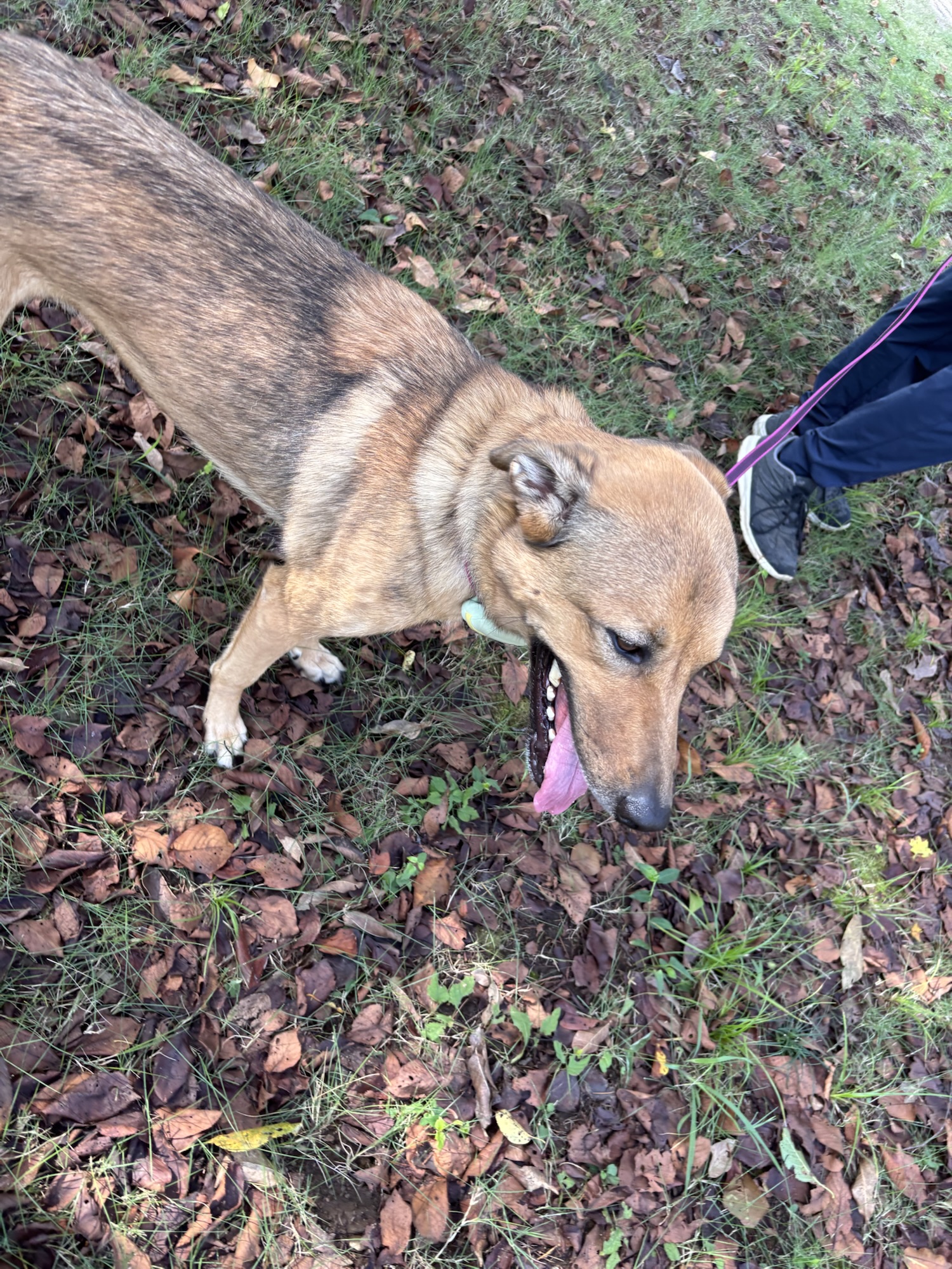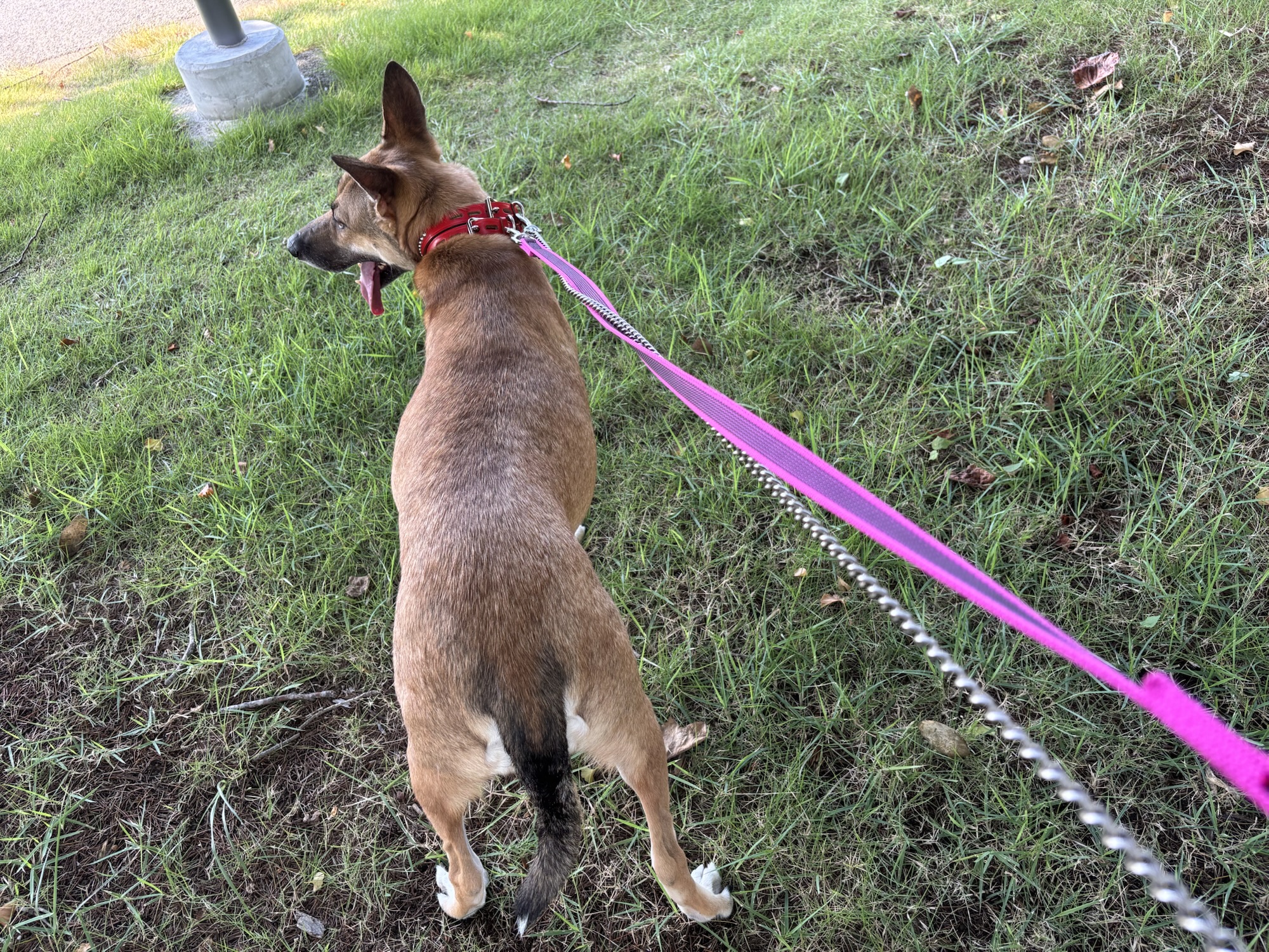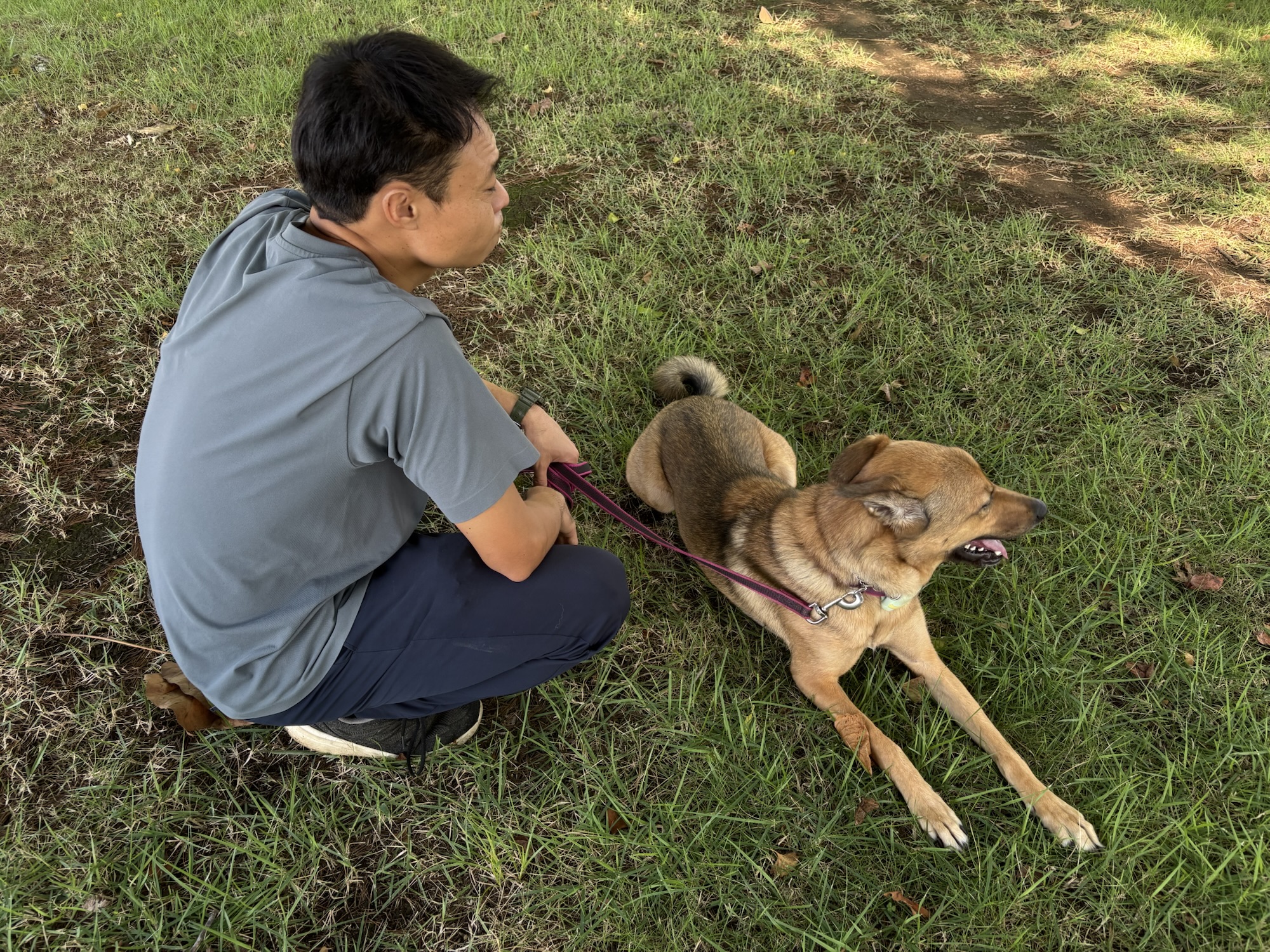 トゥルーは、先生にリードを握られて緊張しています。