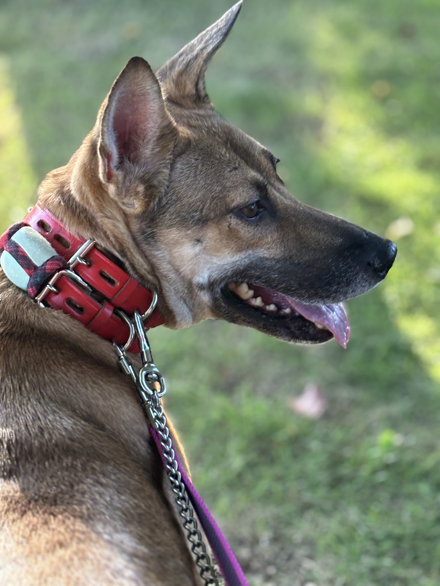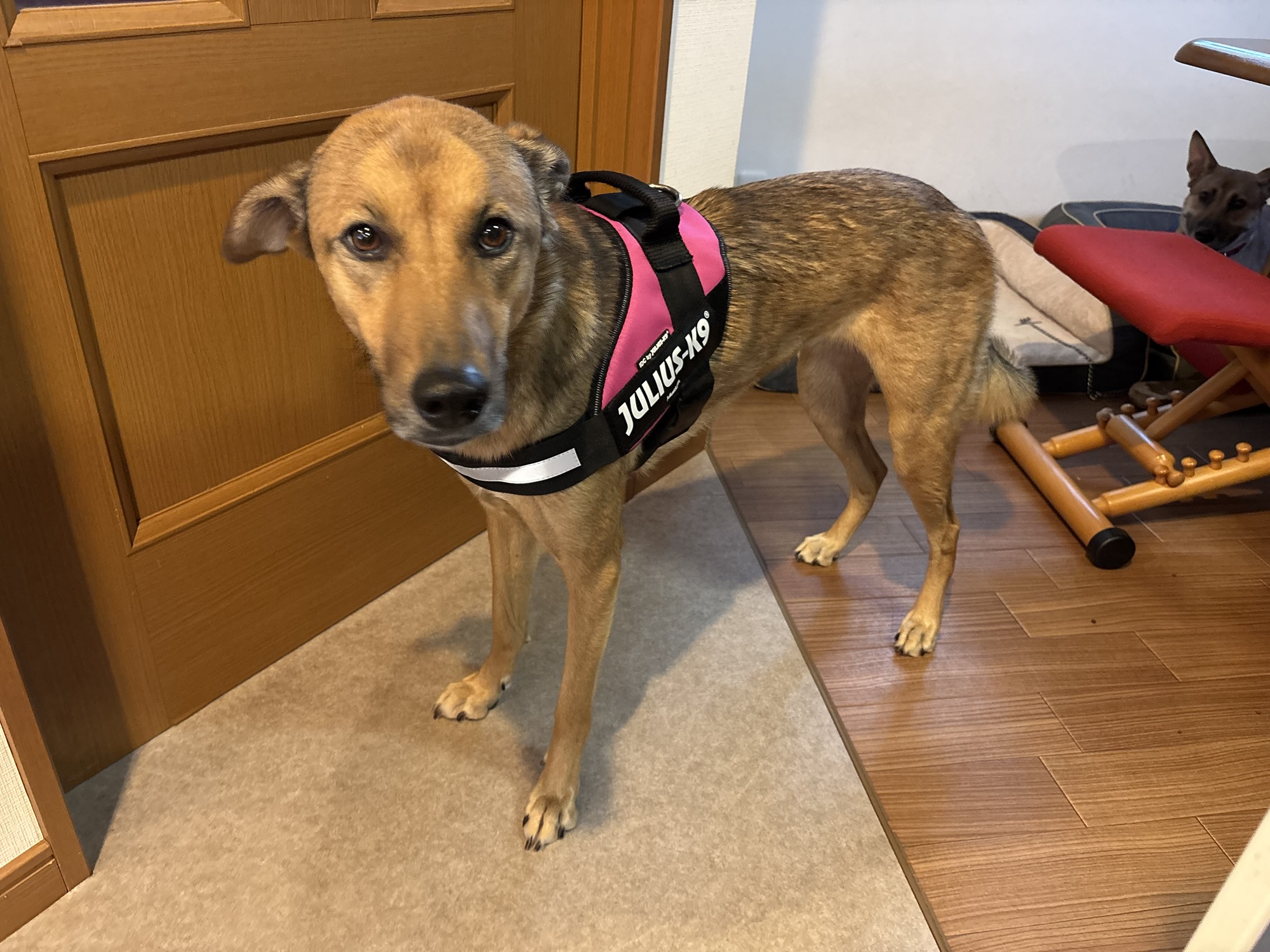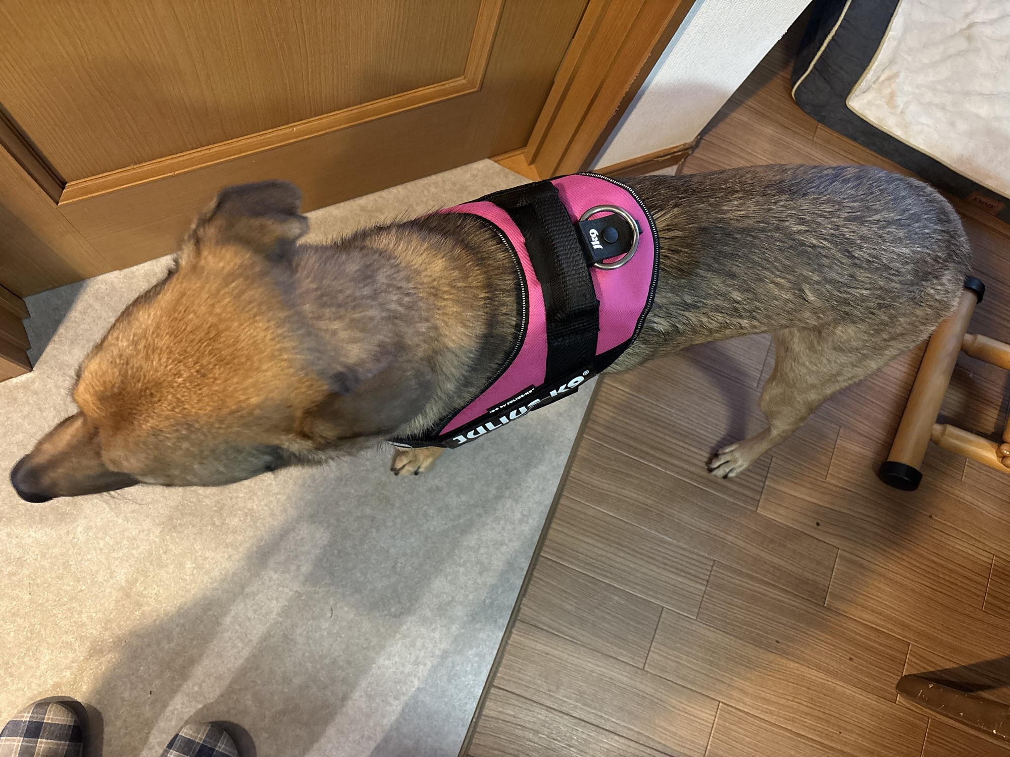 さてさて、トゥルーたんにユリウスK9のハーネスを装着ですよ。