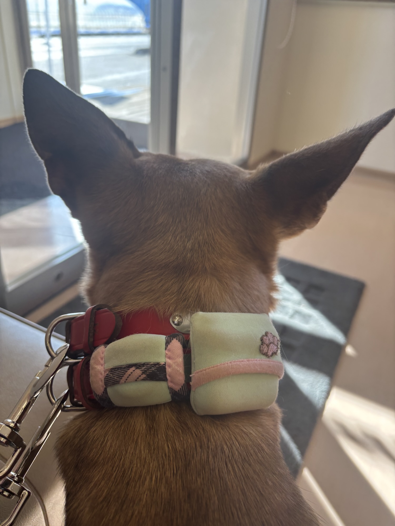 首輪の左側はエアタグ、右側はまもさーち3(GPS)