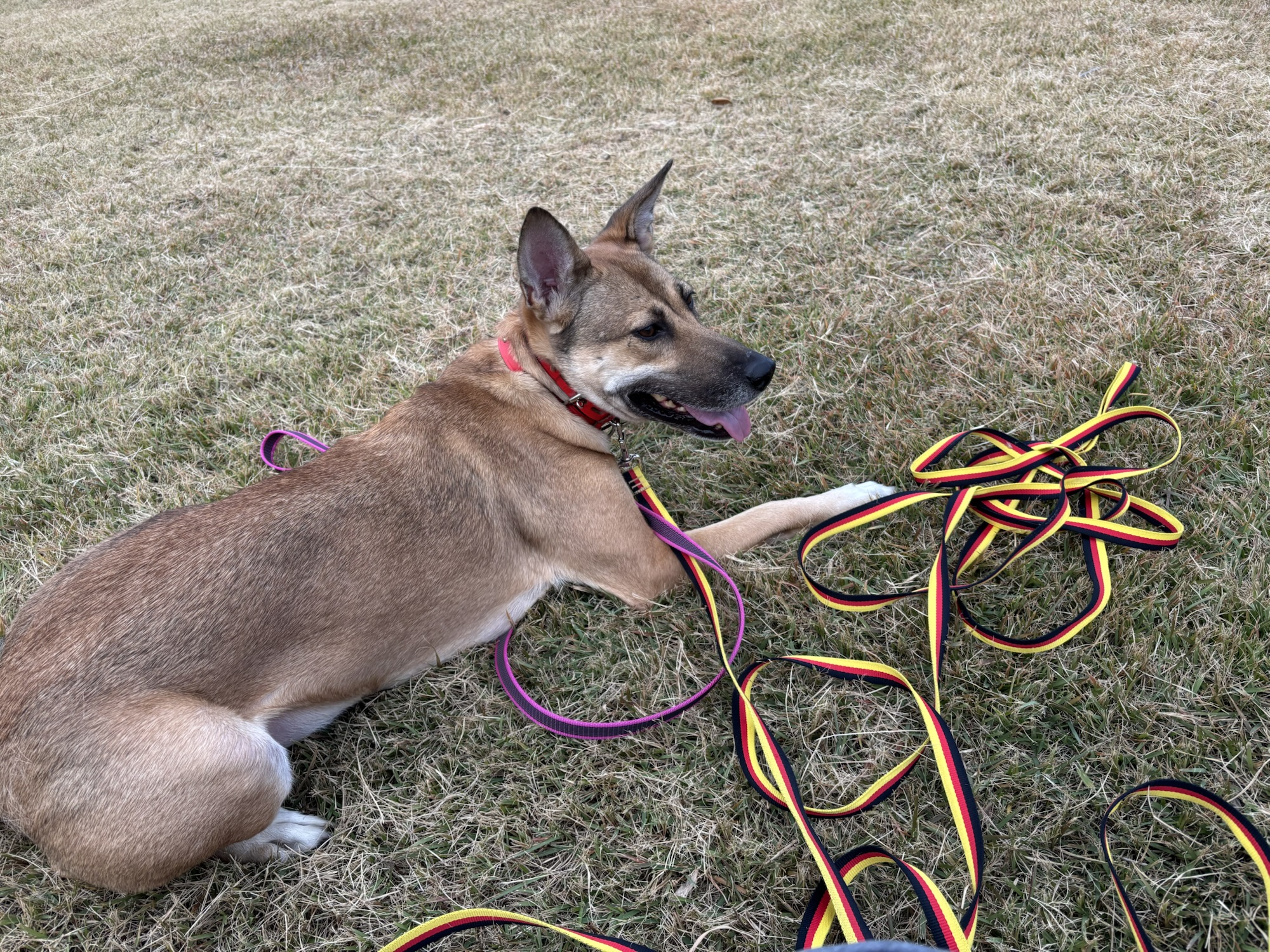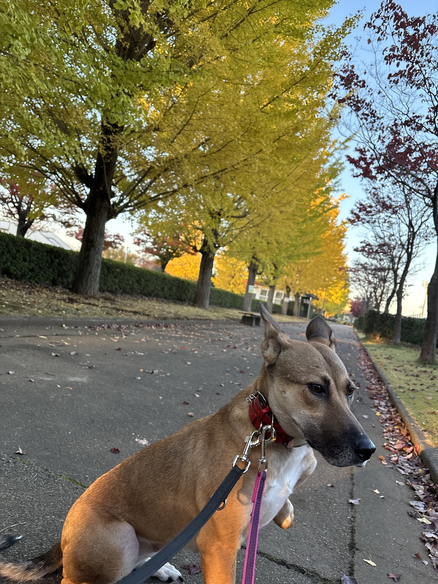 2025年11月15日 トゥルーたん♀(雑種)新教育係になりました。,ミク♀雑種(里親募集中),お散歩練習,リード練習,車に乗る練習,保護犬,収容犬情報,ドッグトレーニングの様子,保護わん家族となかまたちプロジェクト,記事リンクのシェア 紅葉と寝ぐせ